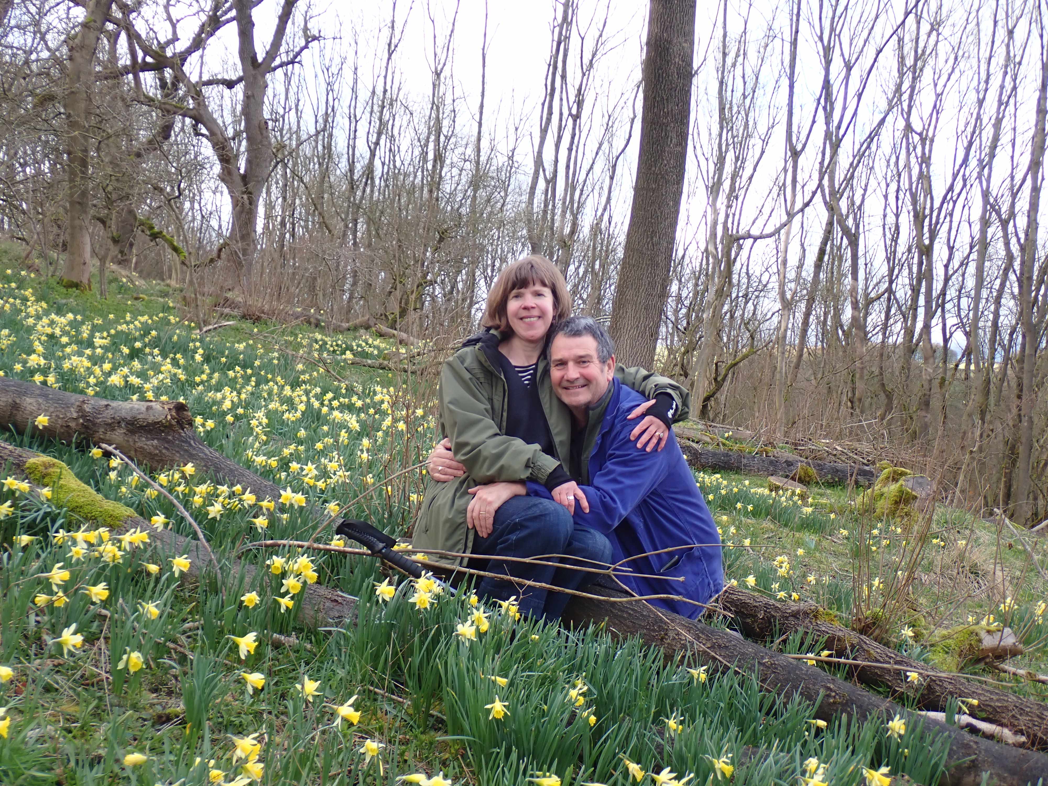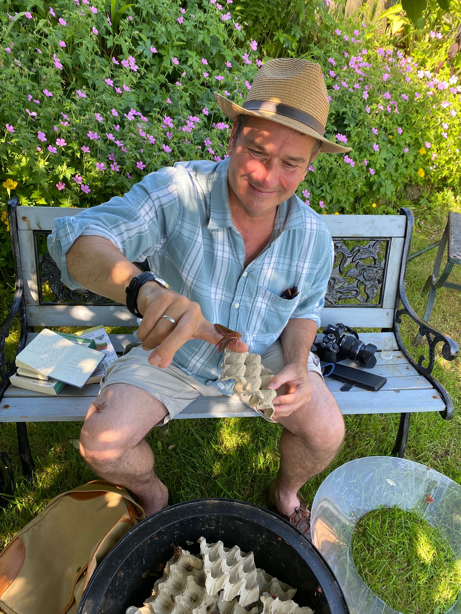 Left top clockwise: mothing at 185 Lightwood Road, Eyeing Euphrasia at Longstone Edge, Derbyshire; supplying salts to silver-studded blue butterflies at Monodendri, Epirus, Greece; with Maria among the wild daffodils at Deep Dale, Derbyshire; in pursuit of Mezereon at Priestcliff, Derbyshire.